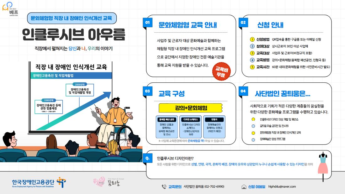 장애인, 노인 등 특정계층 만을 위한 디자인이 아닌 모두를 위한 인클루시브(inclusive) 디자인 의상과 장애 보조기기 등을 융복합 패션공연과 체험 쇼케이스로 구성하여 사업체의 환경과 특성에 맞추어 교육을 진행합니다.