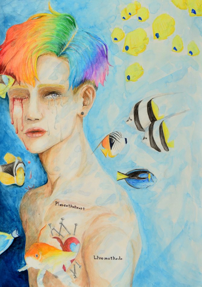예전에 나는 친구들에게 괴롭힘과 왕따를 당한 적이 있다. 그때 누군가가 돌을 던져 눈에 상처가 나고 다치게 되었다. 꿈 바닷속에서 예쁜 물고기들이 위로해 주고 눈물을 흘리는 어떤 남자를 상상해 보았다.