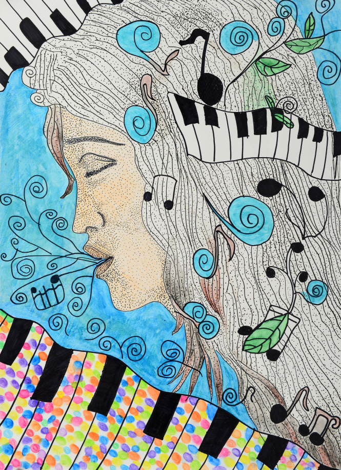 듣지 못하는 슬픔에서 벗어나 음악, 그림, 대화를 통해 기쁨을 찾은 그림을 그린 것이다. 음표가 주변에 떠 있어 주변이 항상 즐겁다는 것을 표현해 보았고, 입과 주변에 음표와 비슷한 곡선을 그려 넣어 즐거움을 표현했다.