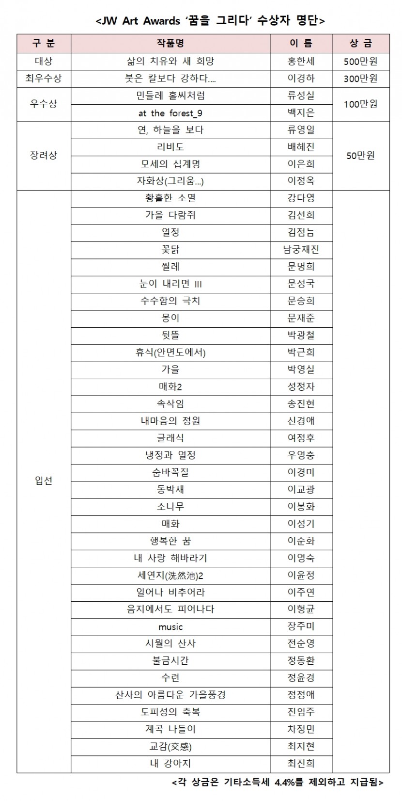 2017 JW ART AWARDS 수상자 발표 페이지 정보 작성자 꿈틔움 작성일17-10-27 08:59 조회3,199회 댓글0건 목록 본문 <2017 JW ART AWARDS 수상자 발표> 2017 JW ART AWARDS 「꿈을 그리다」 최종심사 결과를 다음과 같이 발표 합니다. 총 42명 선정 (대상 1명, 최우수상 1명, 우수상 2명, 장려상 4명, 입선 34명) 되었음을 알려 드립니다. 수상하신 모든분들 진심으로 축하드립니다. 목록